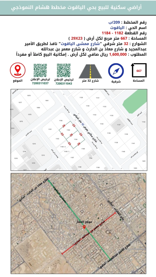 أرض سكنية بحي الياقوت مخطط هشام النموذجي رقم القطعة 1182 المساحة 667 متر طول الضلع على شالراع 23 متر العمق 29 متر شارع 32 متر الشرقي الممشى بجوار الخدمات و الشوارع التجارية